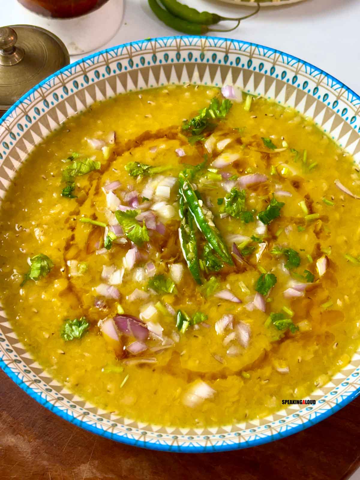 - Add some chopped onion, green chilies, and coriander leaves, along with a drizzle of mustard oil, to the dal before serving.