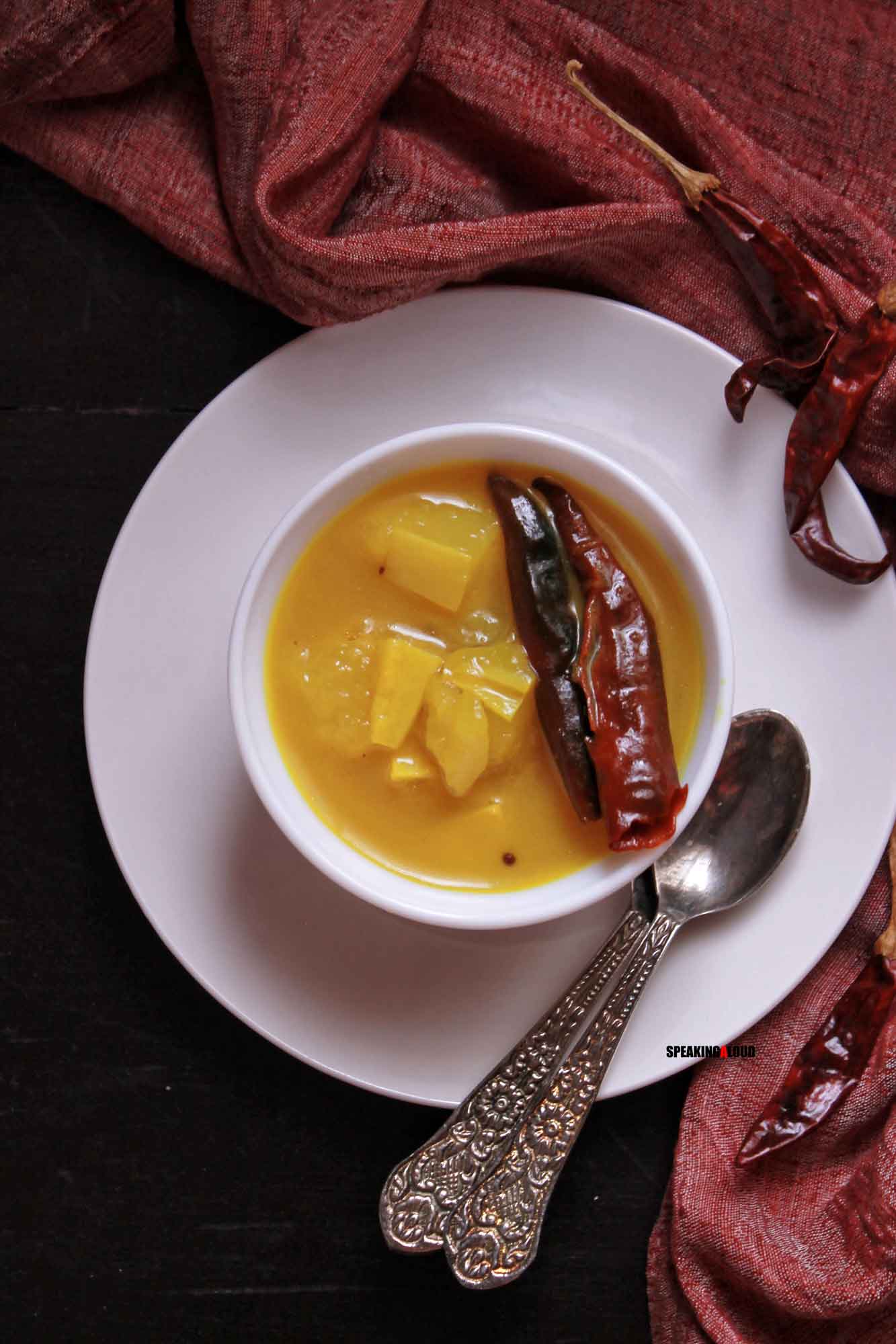 - Stir and add water if required. Add the sugar, again use your judgement. Sugar should balance the sharp tang of the mango, but should not make the dal overtly sweet.4 tbsp Sugar
