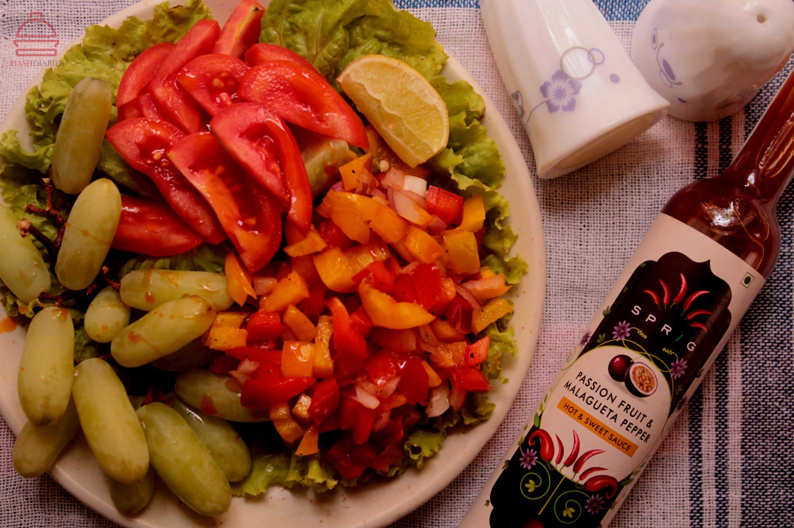 Sometime ago, I was fortunate to collaborate with a gourmet food brand which happened to have launched an amazing range of Spices & Sauces in India. The moment I saw those Hot Sauce Dressings in the hamper, I knew I had to make some Garden Salad recipes with them. This Green Salad recipe was perfect for summers, alas I could only manage time to write it down after it ended. Thankfully I jotted down the recipe, so here comes my super quick Tropical Garden Salad recipe with SPRIG Passion Fruit – Malagueta Hot Sauce